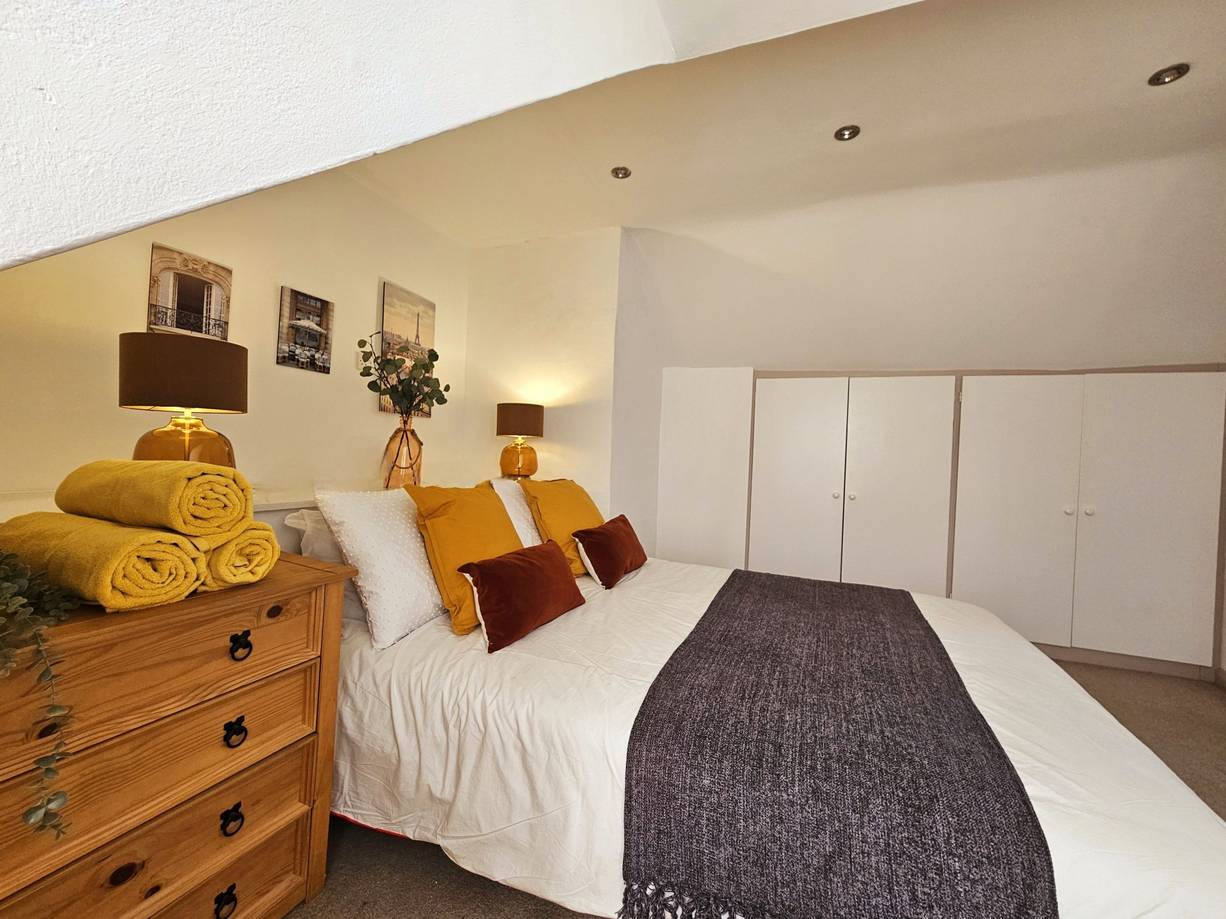 Back inside, head upstairs to the first floor, where you’ll find a spacious family bathroom with a walk-in shower and a traditional antique roll-top bath (the roll top bath is 100 years old and has all the character you would expect to find in such a beautiful old object). Next door is a separate toilet. Two charming double bedrooms (sleeping two adults each) are also located on this floor, both offering good storage with cupboards and shelving.