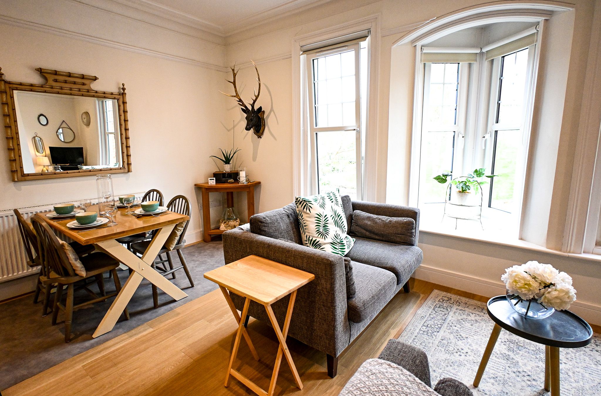 Climb the stairs to the first floor and step inside. The open-plan living space greets you with warmth — soft lighting, comfortable seating and the gentle glow of the stove-effect electric fire ready for later. You drop your bags, open a window and breathe in the sea air drifting up from the shore.
