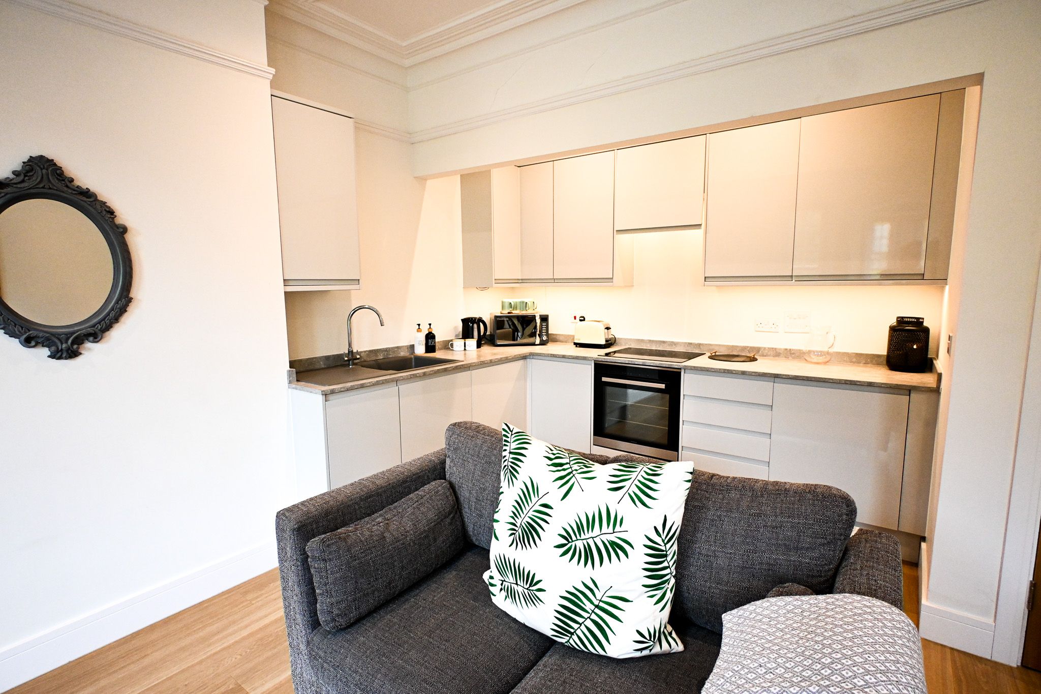 The kitchen sits neatly to one side — sleek induction hob, electric oven, dishwasher, washer/dryer — everything in its place. You imagine slow breakfasts at the dining table, coffee steaming beside you before a beach walk just minutes away.