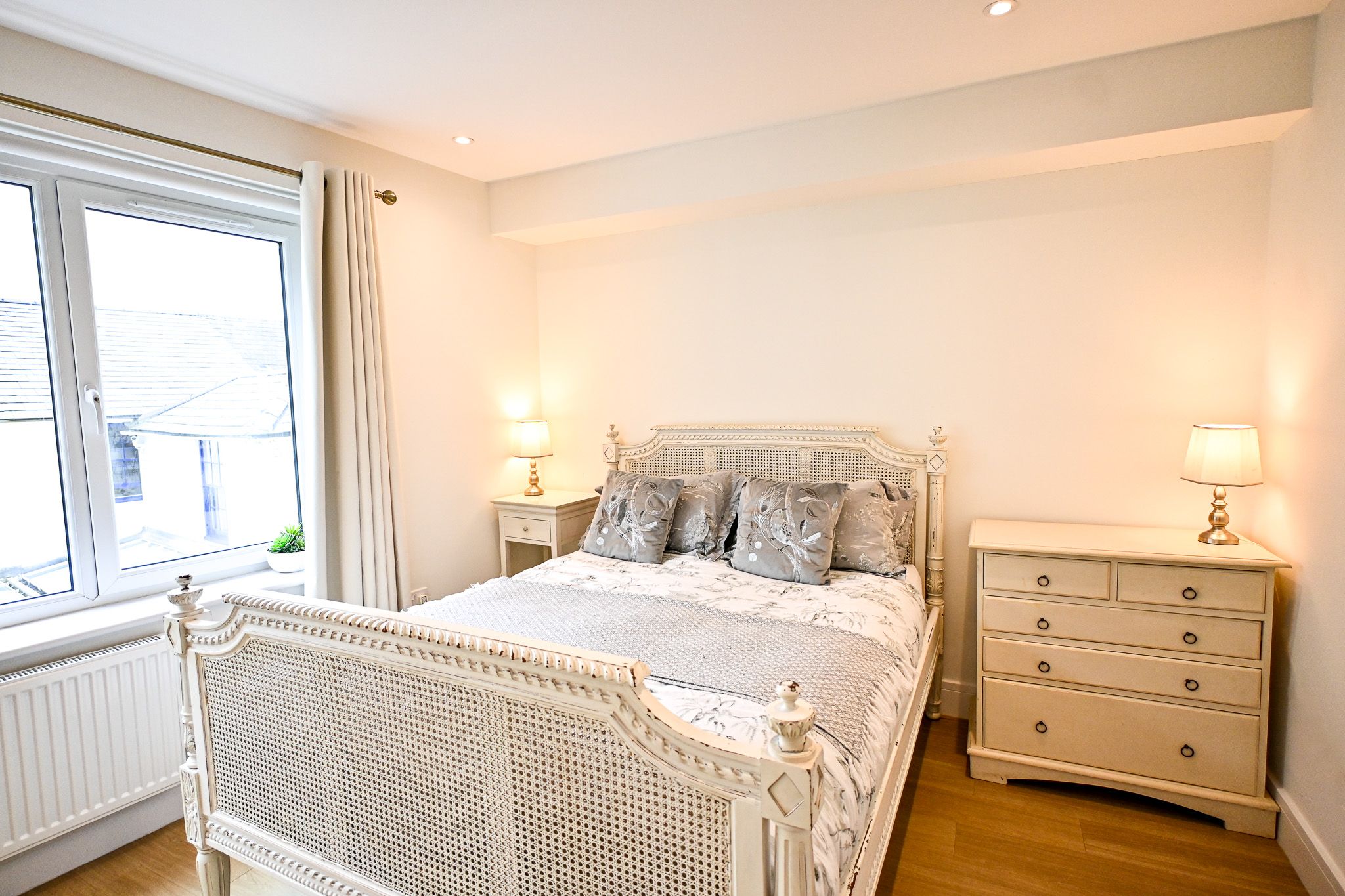 The spacious king-size bedroom feels calm and restorative, while the smaller double is perfect for friends sharing. Three steps lead down to the king sized room and bathroom, adding a gentle sense of separation and privacy.