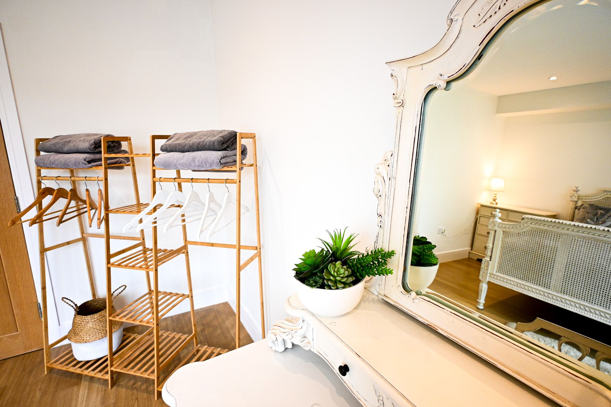 Three steps lead down to the sleeping area, creating a subtle sense of retreat. The king-size bedroom feels peaceful and spacious, the kind of room where you sink into the bed and sleep deeply. The small double offers a cosy second space — perfect for friends sharing the escape.