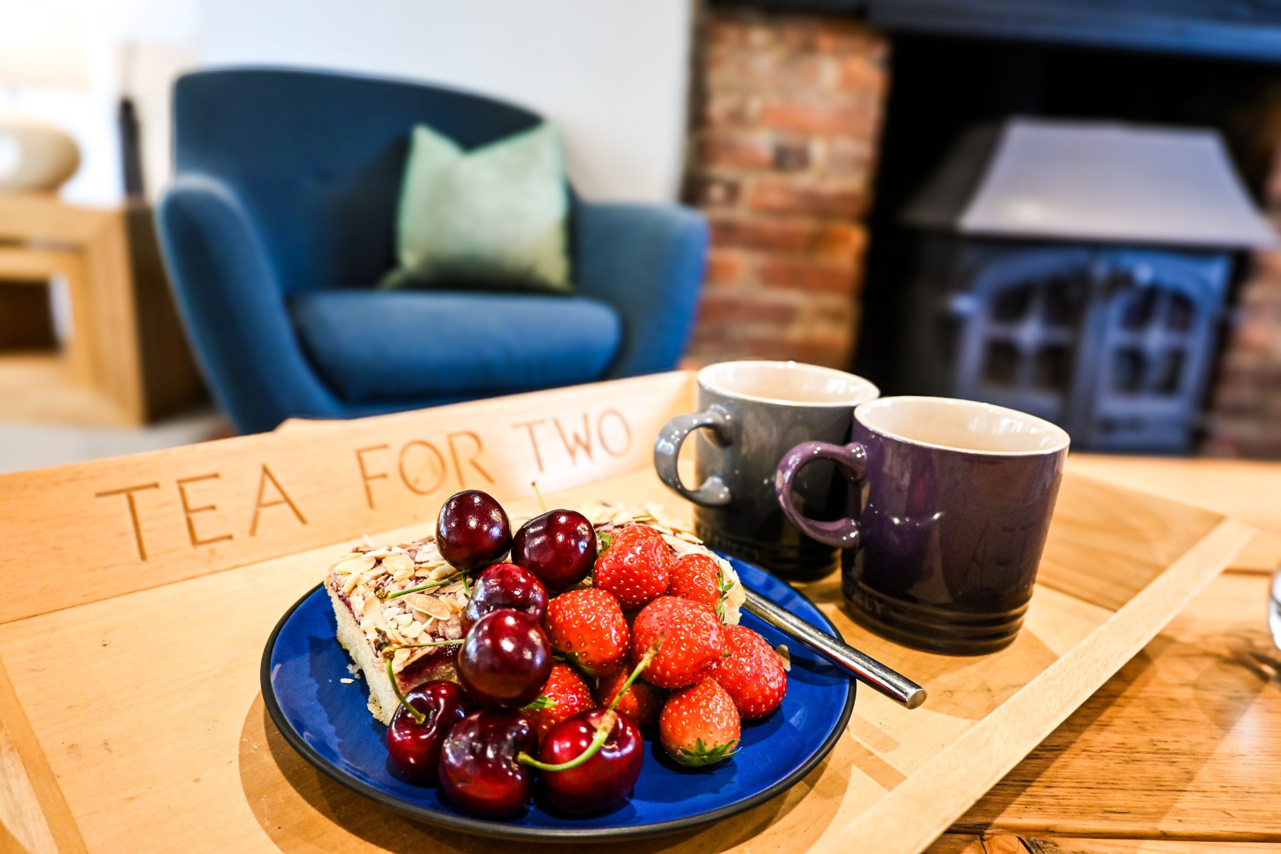 Step up a few stone steps from the front of the unmistakable pink cottage and through the main door into a small porch area. To your right, you’ll find the spacious lounge, a bright and comfortable room with a mix of armchairs and sofas, a large Smart TV and a dedicated workstation for anyone needing to catch up on emails. A log-burning stove takes centre stage and a complimentary basket of logs is provided at check-in to get you started on those cosy evenings in.