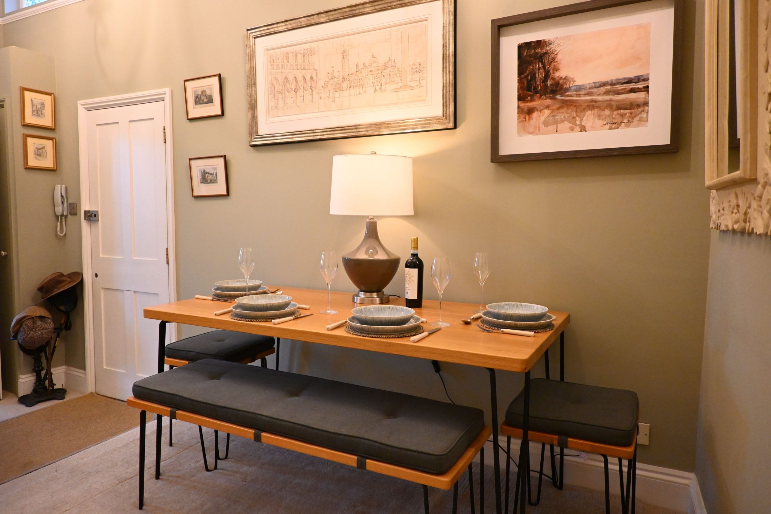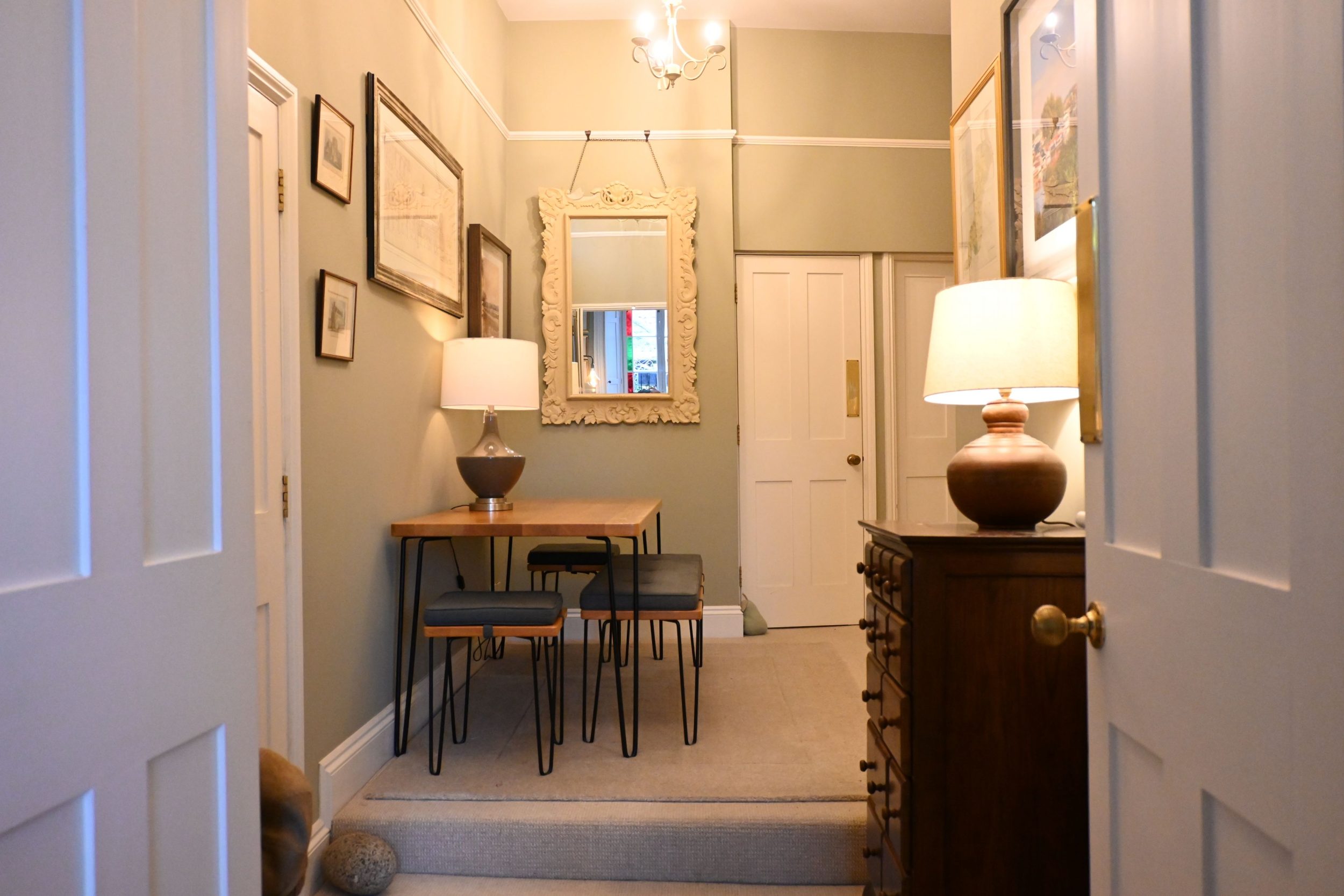 As you arrive at King’s Apartment from street level, you enter through a shared doorway and ascend a single flight of stairs to reach the first floor. At the top, the apartment's private entrance opens into a wonderfully spacious hall, cleverly designed to double as the dining area. This bright central space sets the tone for the rest of the apartment—welcoming, airy and beautifully finished.