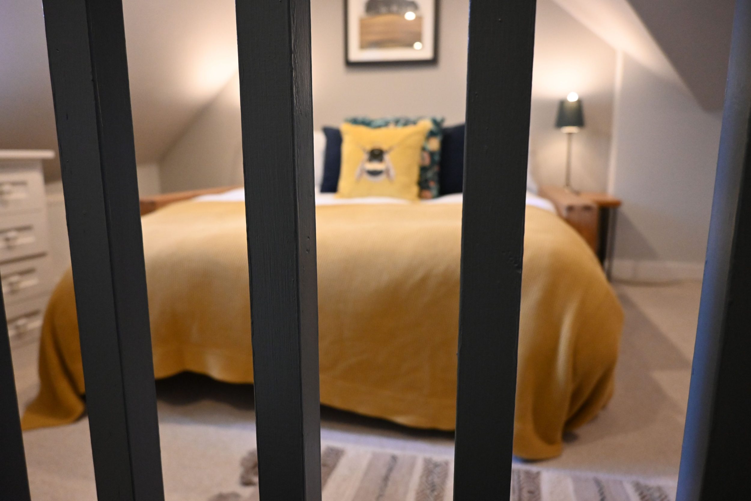 The layout is ideal for couples, friends, families or colleagues travelling together. One bedroom sits on the original first-floor level, thoughtfully furnished with comfort in mind. Upstairs, tucked into the eaves, is the second bedroom, a charming space featuring a dedicated workstation—perfect for remote workers or those here on business.