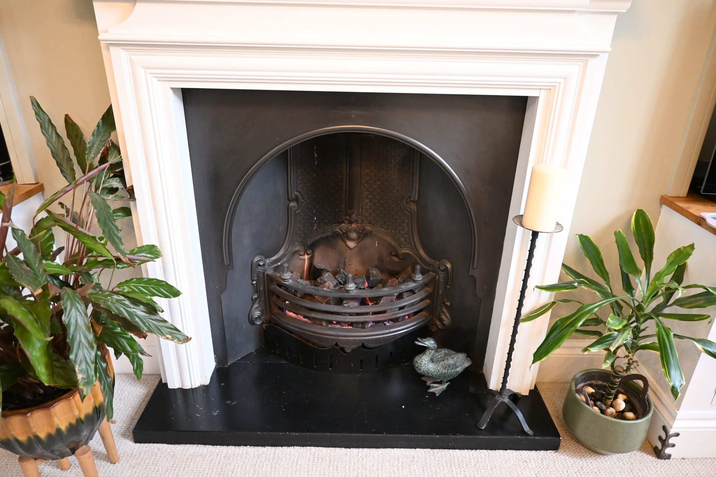 Inside, the apartment is decorated in soft pastel tones—corals, olives and warm neutrals—drawing inspiration from classic William Morris patterns to create a soothing, timeless atmosphere. The open-plan kitchen, dining and living area is the true highlight of the home, with impressive floor-to-ceiling windows that flood the space with natural light. The cool, airy feel of summer days transitions beautifully into cosy winter evenings thanks to the inviting coal burner.