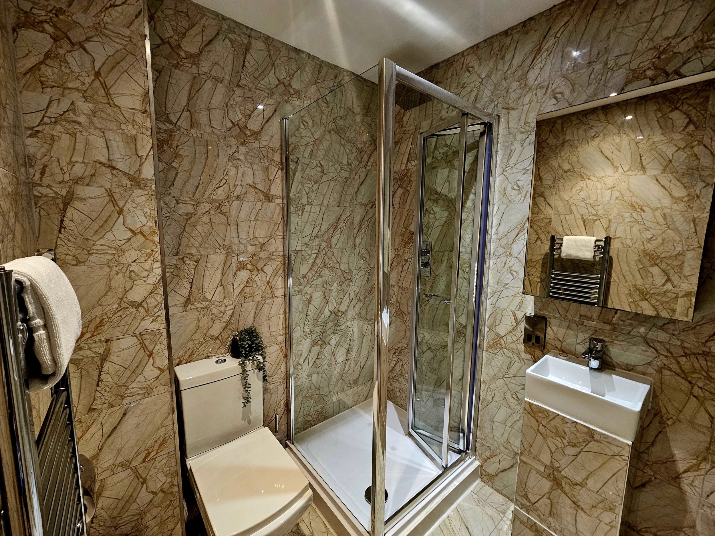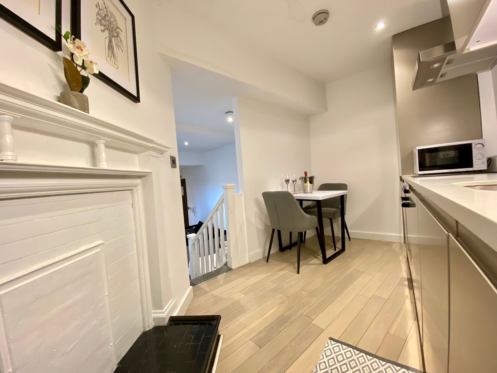 Just up a few steps at the rear of the studio, you’ll find a small but well-equipped kitchen with everything you need to prepare meals or snacks during your stay. There’s also a dining table for two, perfect for breakfast before heading out or enjoying an evening in. The modern shower room adds to the convenience, offering a clean, fresh space to get ready for the day or wind down at night.