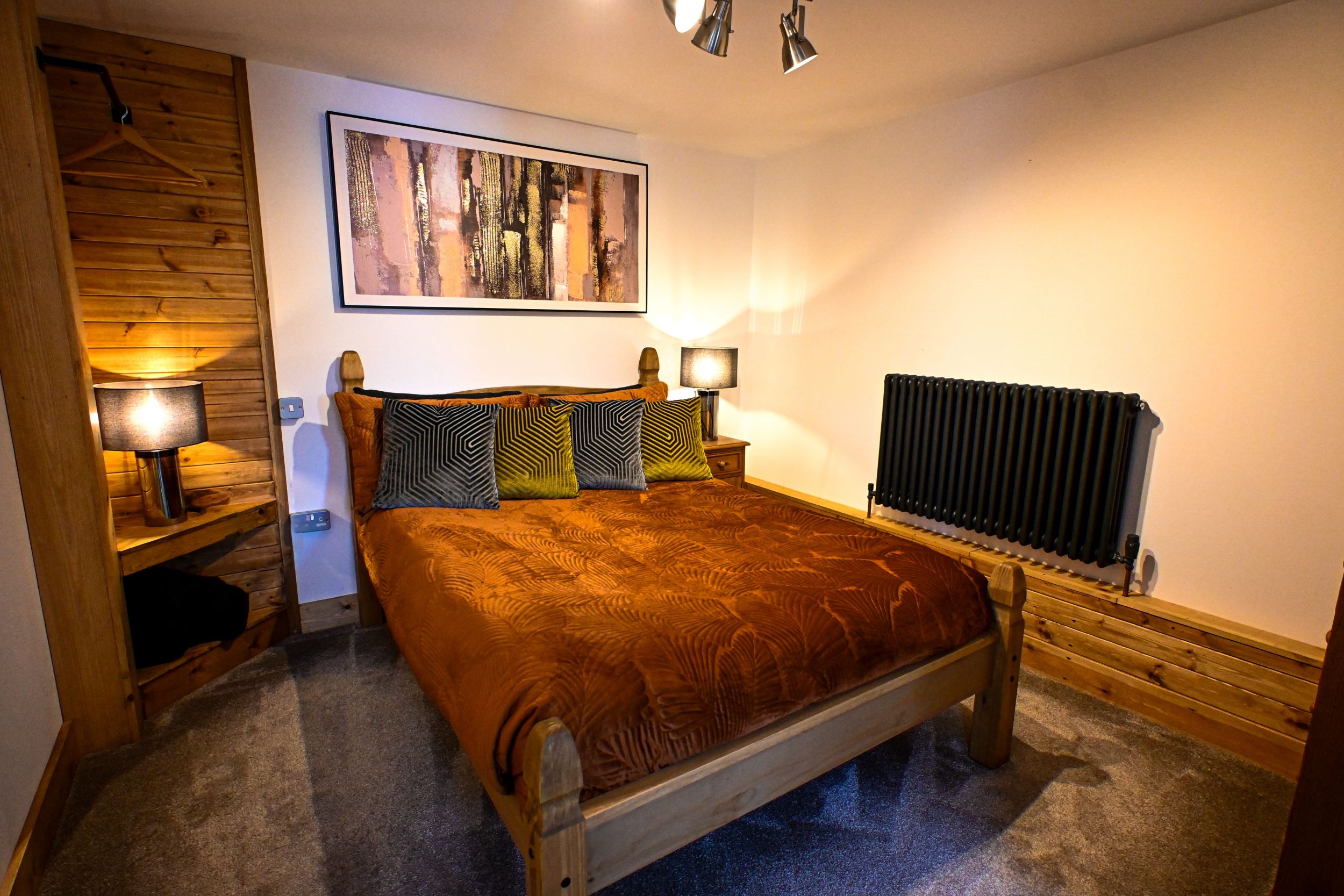 Entering the larger cabin, you are welcomed into a spacious hallway with opulent décor and a high-quality sofa bed. Two front bedrooms sit off the hallway, each featuring plush bedding, ample storage and luxurious en-suite shower rooms. The large hallway that also houses the comfortable extra sofa bed, leads into the expansive open-plan living area with generous sofa seating, a smart TV, and a large dining table for up to eight guests. Beyond the dining space is the third bedroom with its own spa-like en-suite bathroom, and a rear door opens to a private garden with a pond and breathtaking countryside views.
