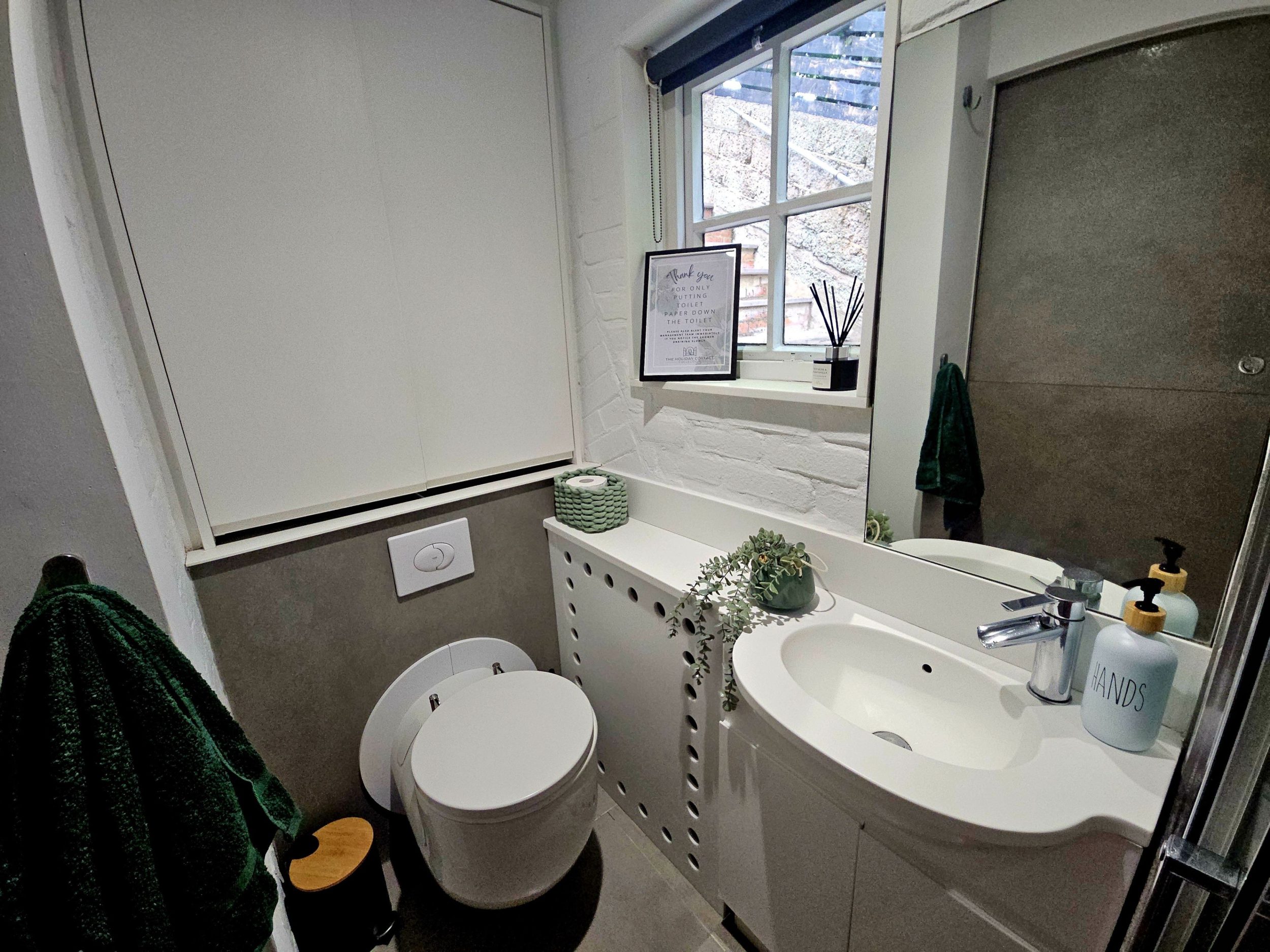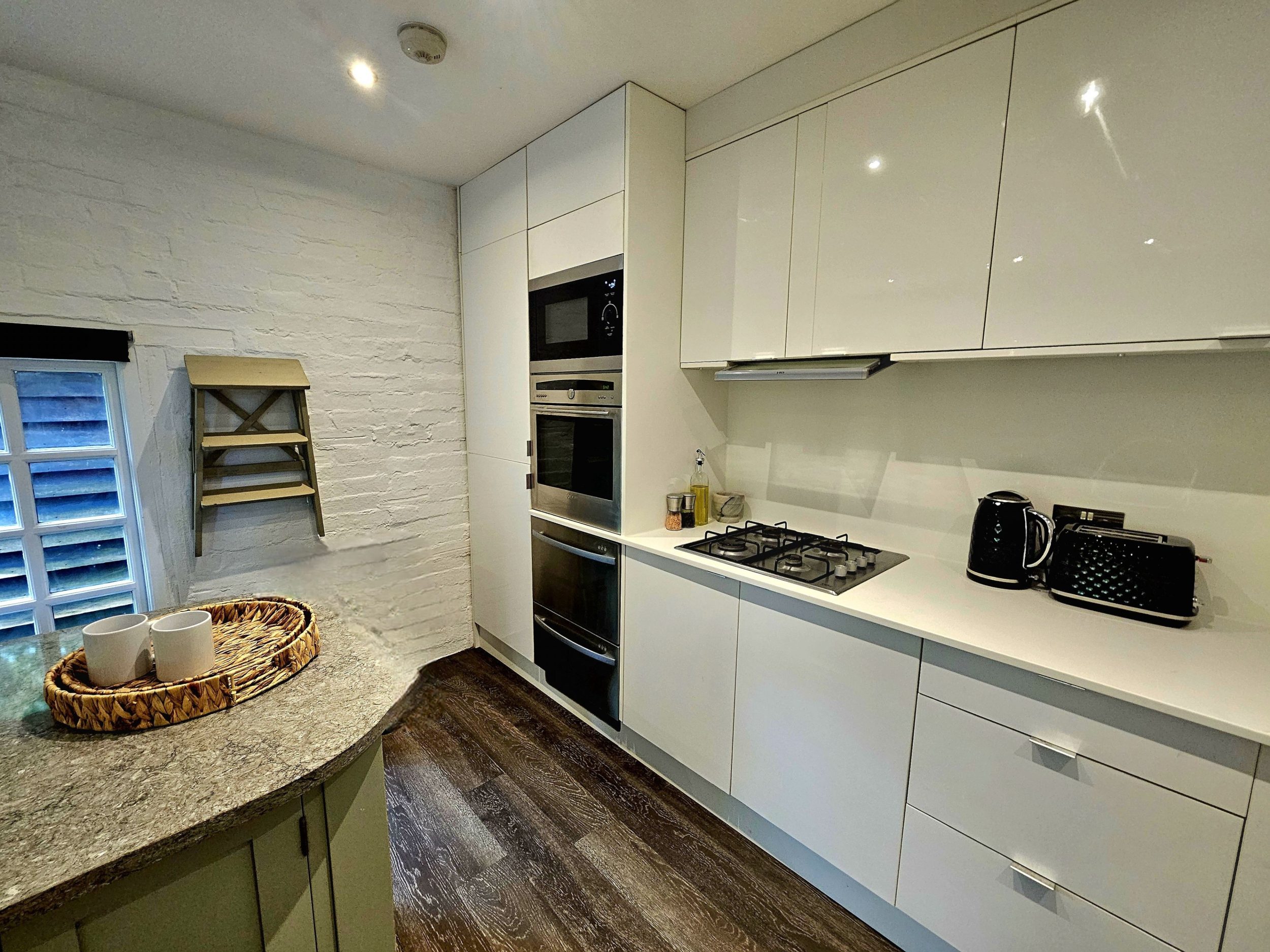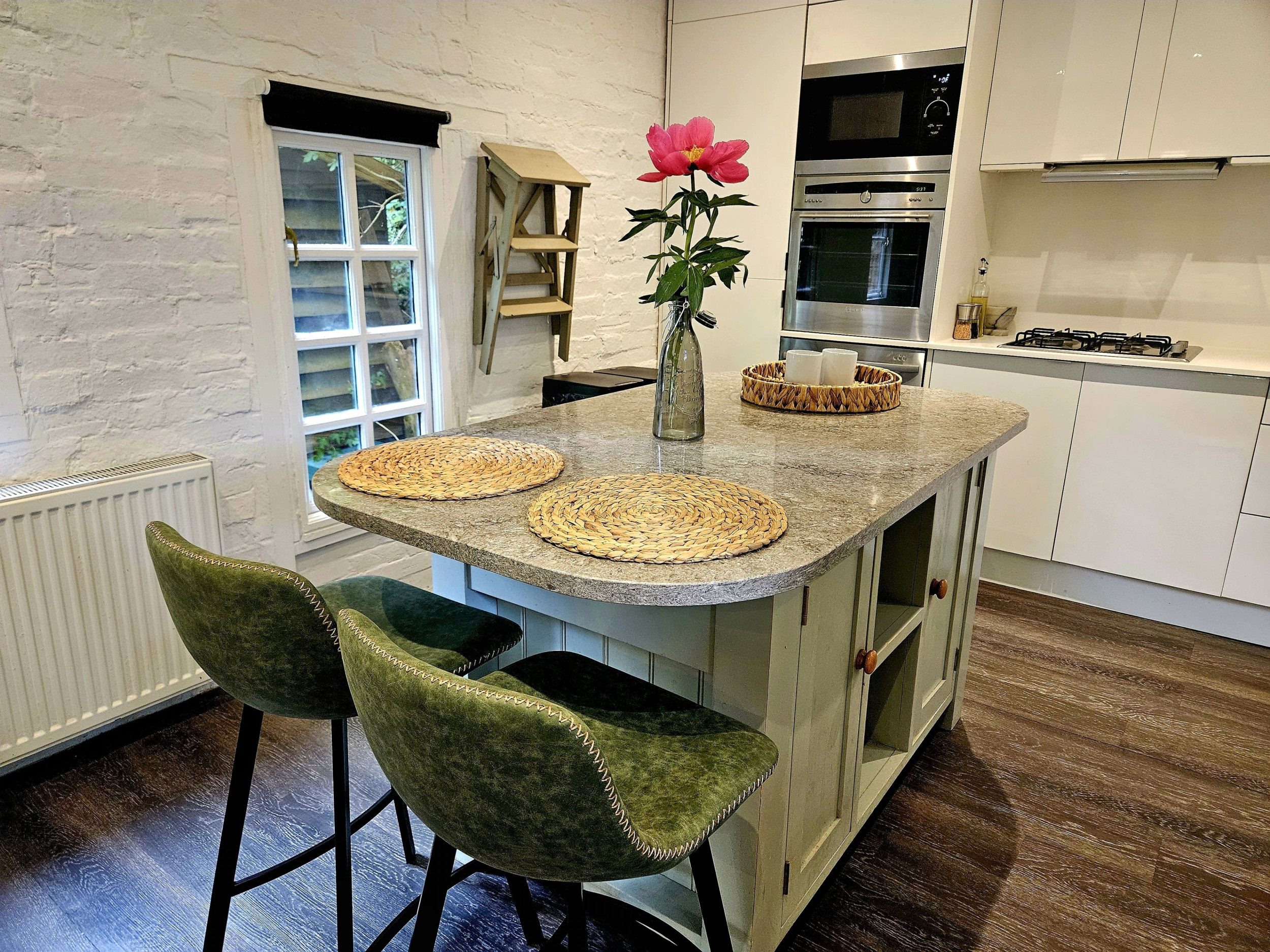 Upon entry, as you descend the steps towards the river, you'll feel a sense of seclusion, despite only just stepping away from the road. The front door at the bottom of the steps opens into the warm, modern, open-plan living space. In the lounge area you will find a plush double sofa bed, perfect for your extra guests, facing a large smart TV. The kitchen stretches across the rear wall, fully equipped with a dishwasher, washing machine, fridge-freezer, oven and hob. A standout feature here is the central island, complete with breakfast stools — ideal for casual dining or morning coffee as the river glides past the windows,