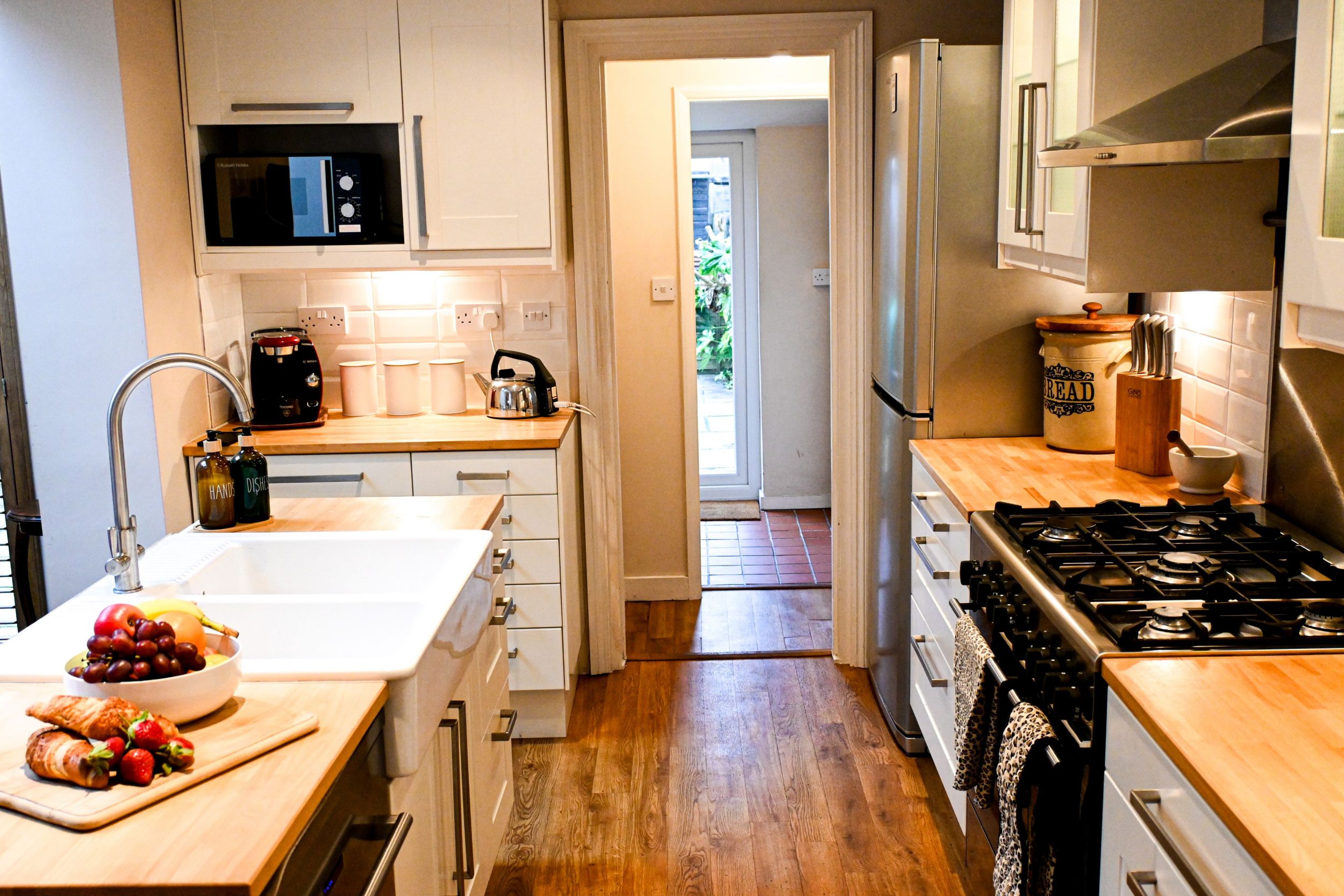 From the lounge, step down into the kitchen and dining area, the true hub of the house. A central kitchen island and large dining range make this space ideal for cooking and gathering together. Fully equipped with modern appliances and a coffee machine, it’s well suited to everything from quick breakfasts to leisurely family meals.