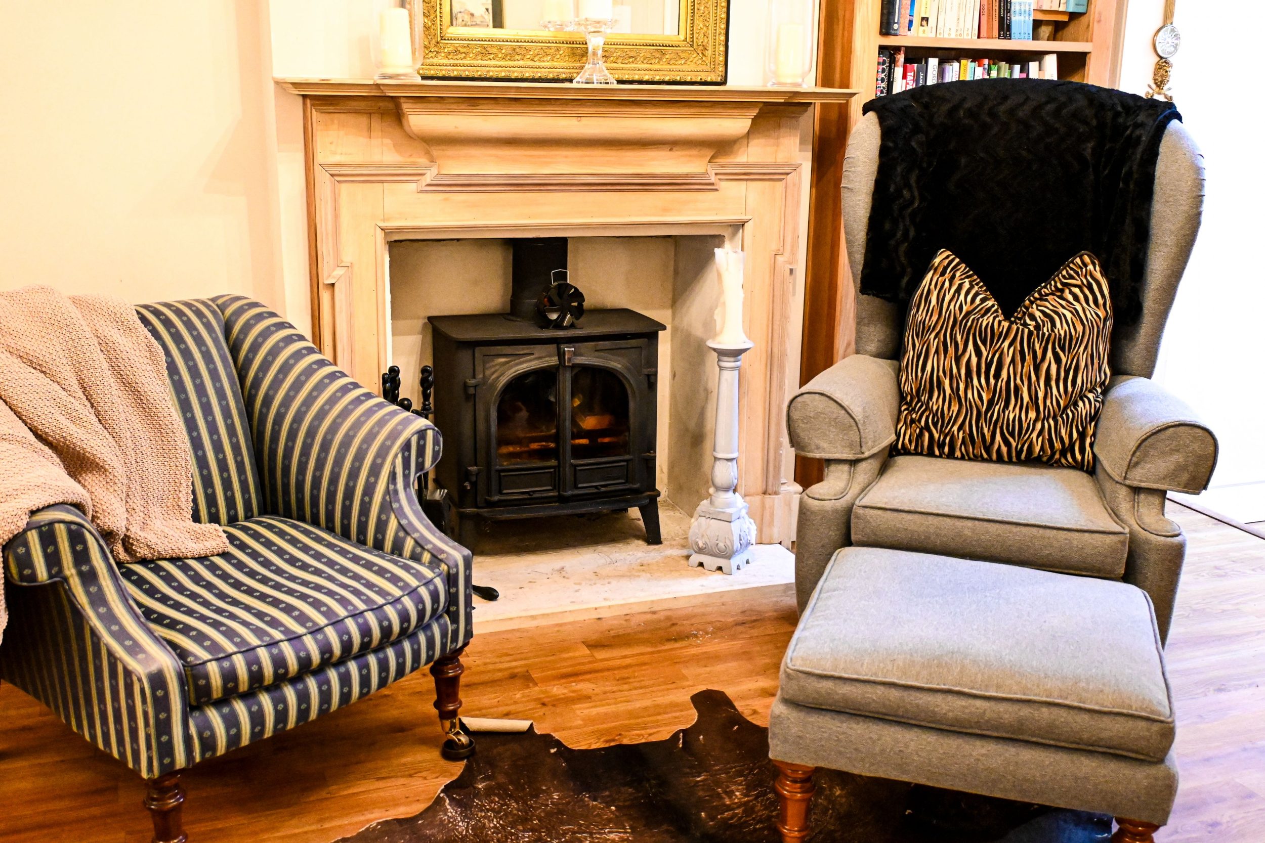 The second lounge area offers a more intimate atmosphere, with two armchairs set around a striking fireplace with a log burner, available for guest use. This space is perfect for reading, chatting, or enjoying a glass of wine as the fire crackles in the background, adding warmth and character to the home.